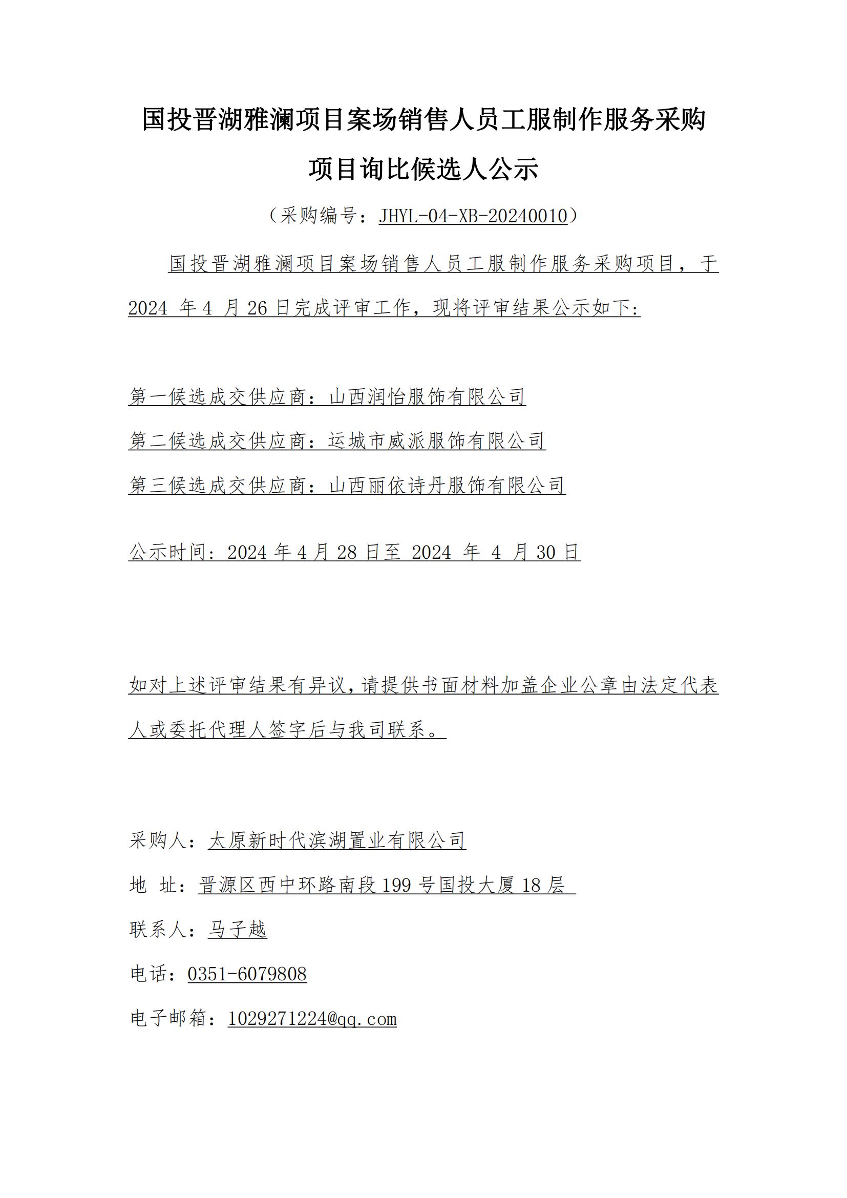 國投晉湖雅瀾項目案場銷售人員工服制作服務(wù)采購項目詢比候選人公示