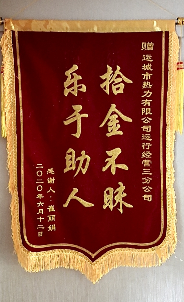 近日,家住理想城的崔女士送來的一封感謝信和一面錦旗,感謝我公司劉兆林同志拾金不昧的高尚品德,感謝公司培養(yǎng)了文明擔(dān)當(dāng)?shù)膬?yōu)秀員工。